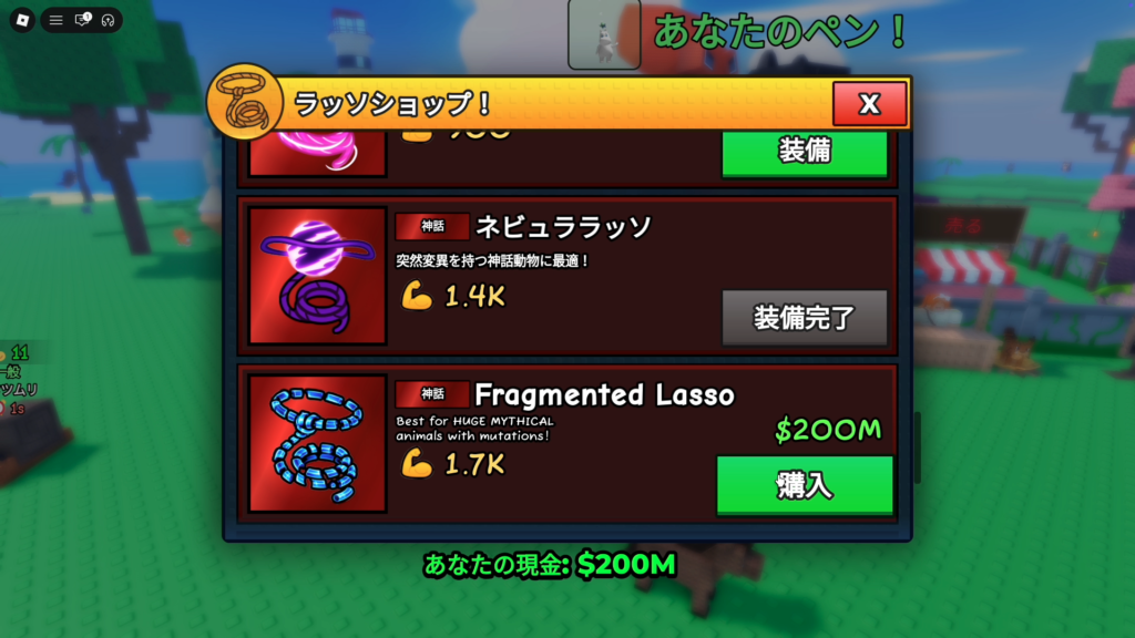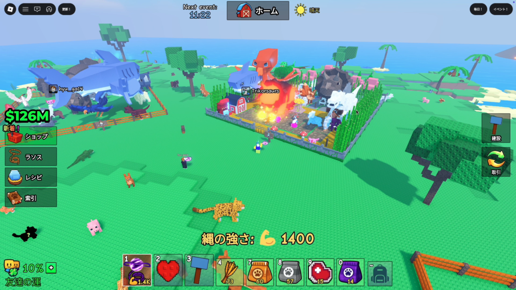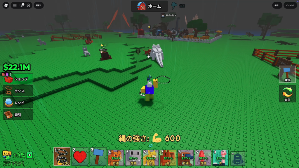- 稼いだお金で、より強い投げ縄・食べ物・建物を買って効率アップ