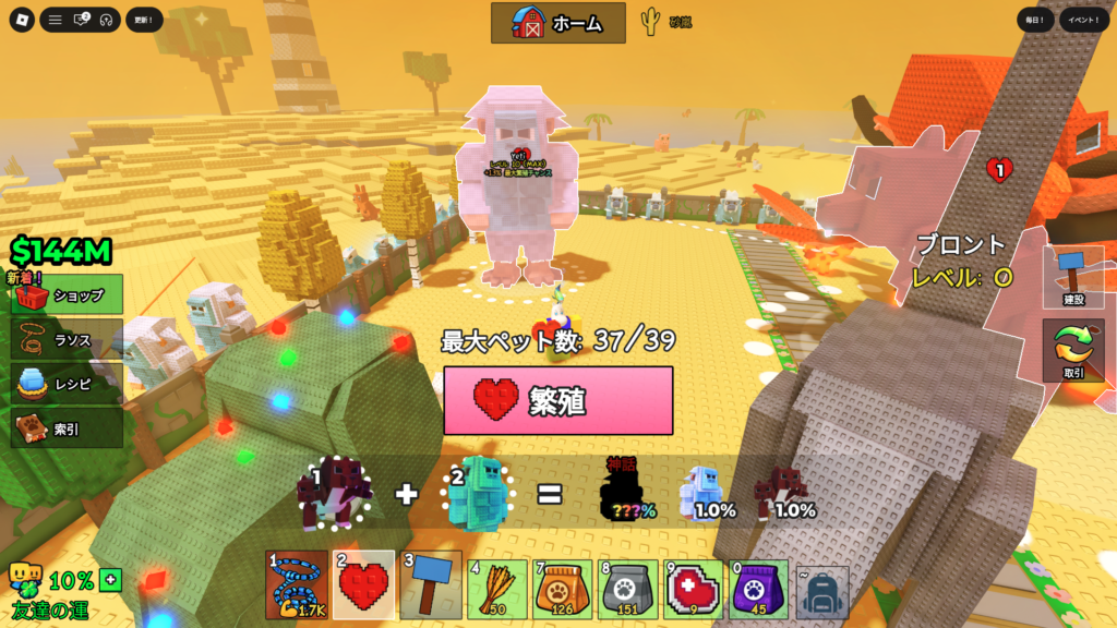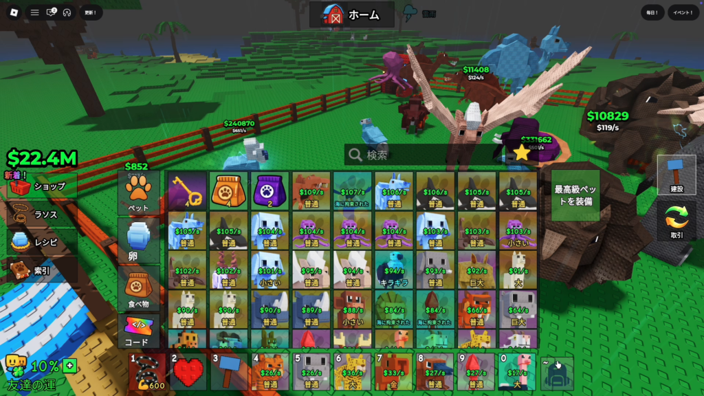 動物にエサをあげて運(Luck)を上げる要素があり、さらにハート(ブリード/合成)で新しいペットを発見していけます。