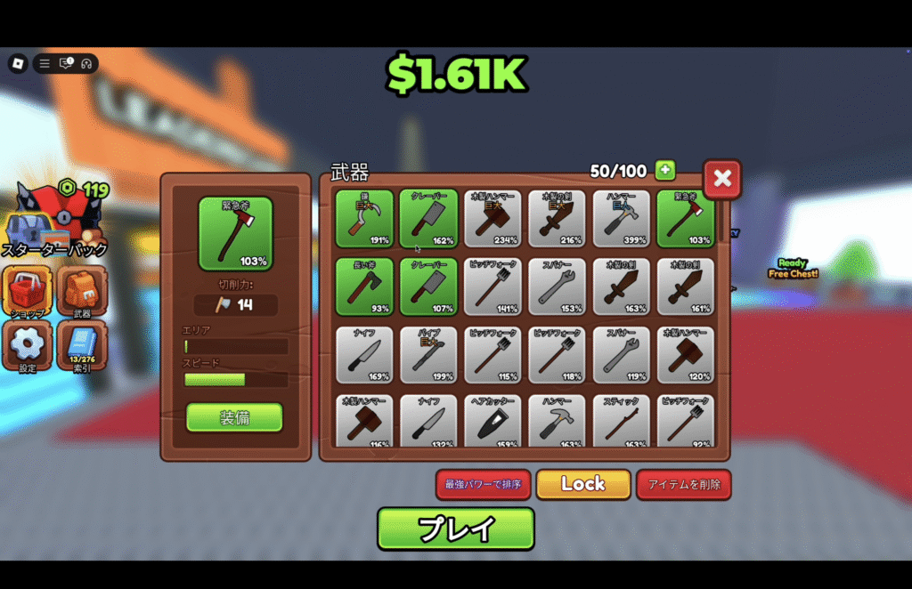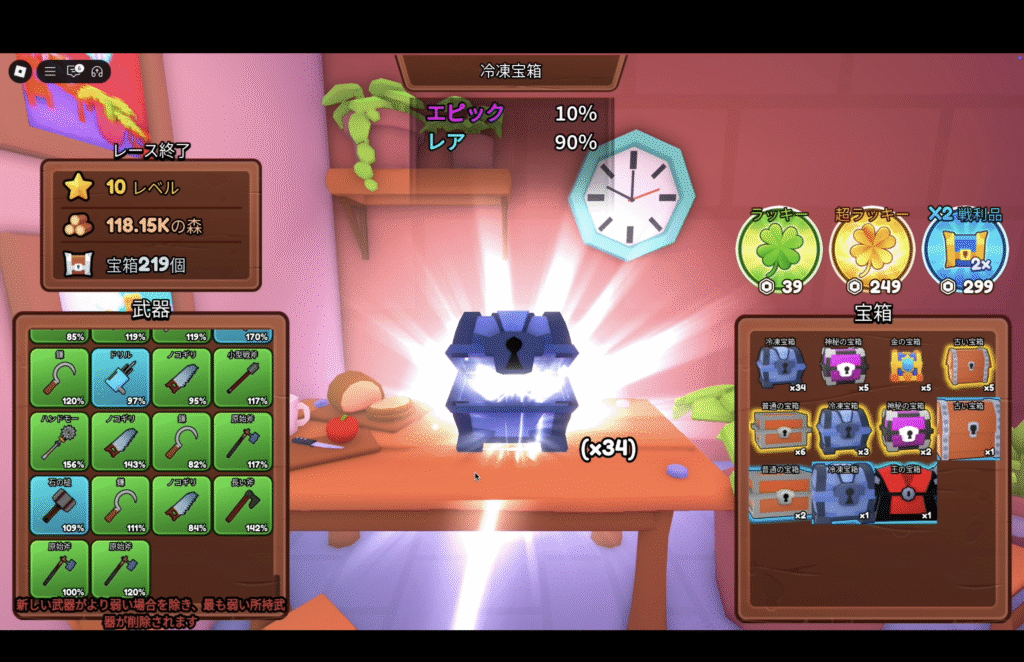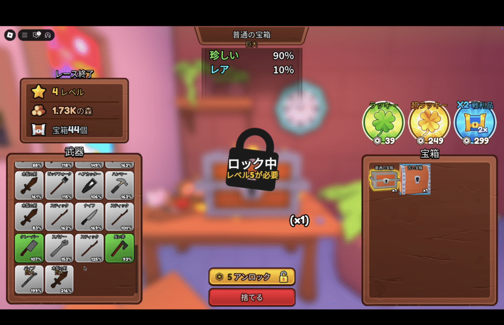 - 宝箱をオープンするとレベルが1から再スタート。毎回一つずつレベルと斧のレベルも上げていくのが結局効率が良い。