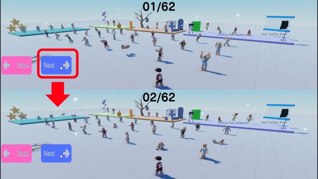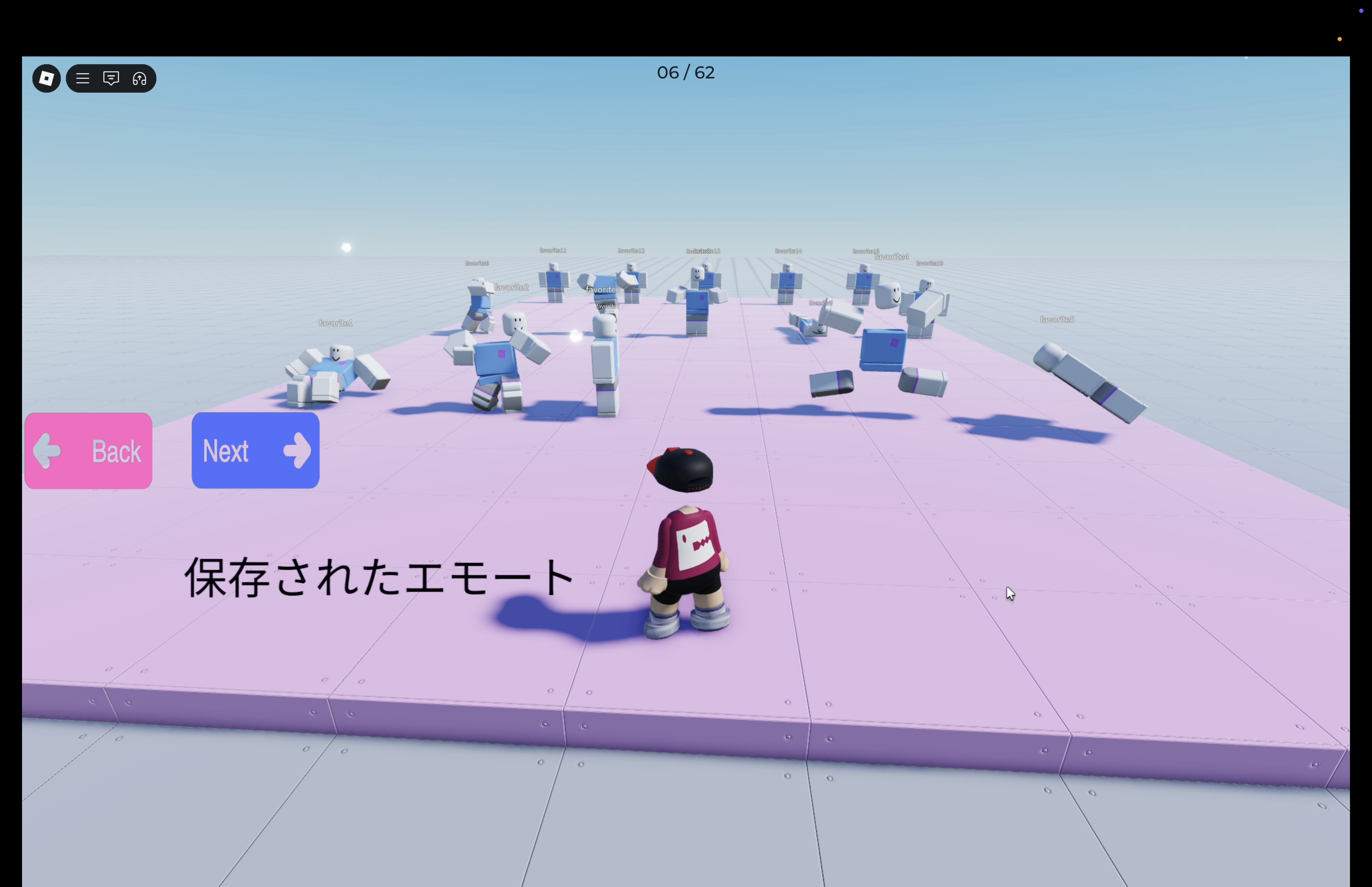 一見いくつかのエモートがあるだけのように見えますが、画面上のNEXTボタンを押すと、すべてのエモートがチェンジされます。次々の無数のエモートが入れ替わりお気に入りのものを見つけるのも簡単です。